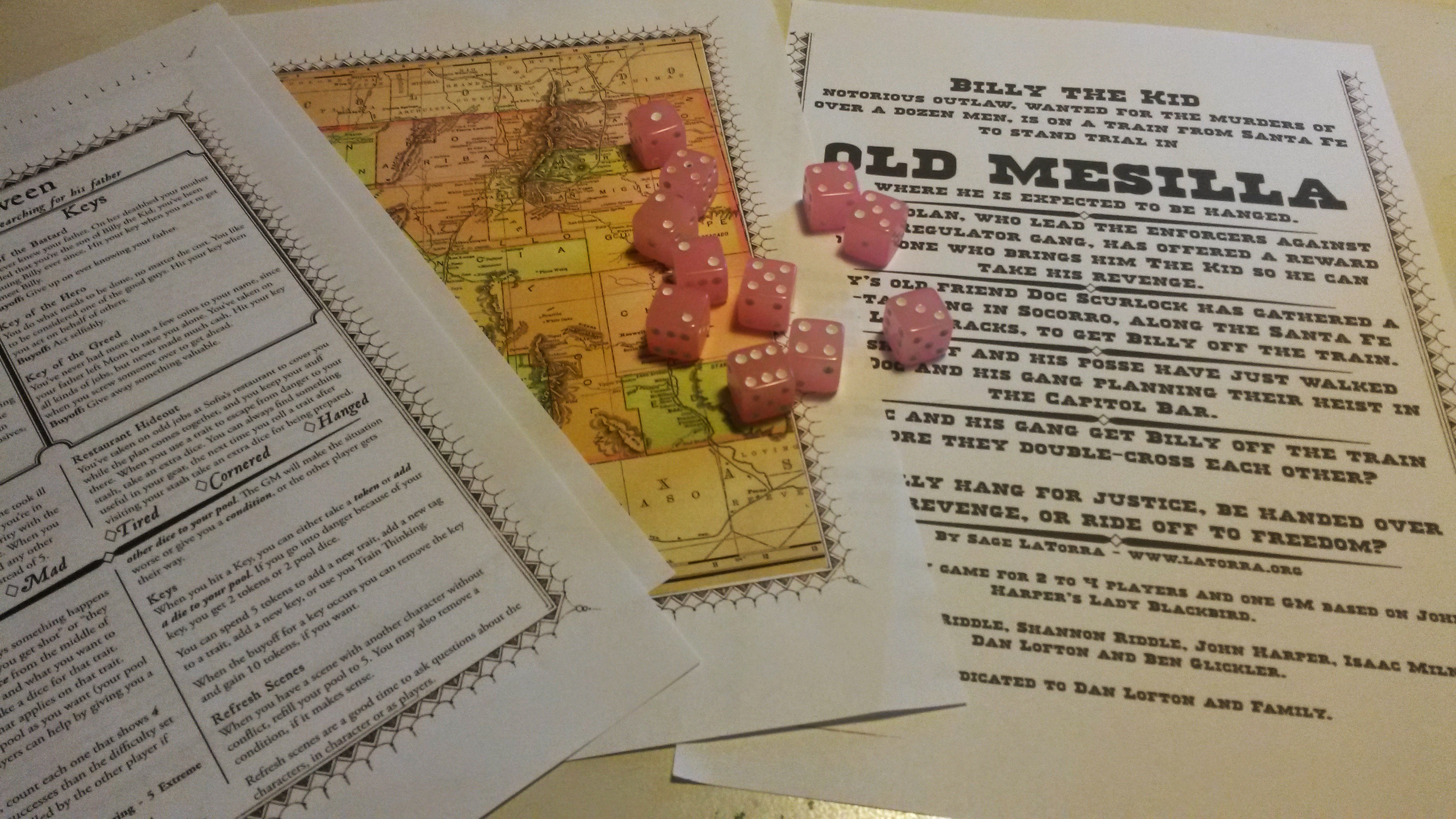 Rollespillet Lady Blackbird, som mere eller mindre er et indie-rollespilsscenarie, har på mange måder været banebrydende inden for koblingen mellem system og scenarie, og det er et rollespil, som formidler verden, historie, karakterer og system samlet og på meget lidt plads. Det har affødt en række hacks, reskins, reimaginings, spin offs, viderebygninger, hvoraf en række kan nedlastes fra Mighty Atoms side. Blandt disse er Old Mesilla, og vi har i gruppen tidligere spillet Lady Blackbird som mini-kampagne, som desværre aldrig nåede til vejs ende, men det er, hvad der sker, og vi besluttede os for at mødes og spille et par af Lady Blackbird-afledningerne. Valget faldt på Old Mesilla.