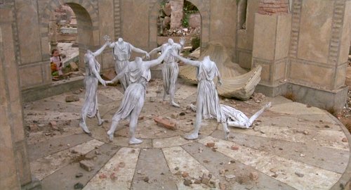 Byen omgivet af junglen: Sejrssøjler bundet af vedbend, glemte paladser, altre med indtørret blod, brønde med dødt vand, solblegede knogler mellem rustne våben, faldne statuer. Tre roller: