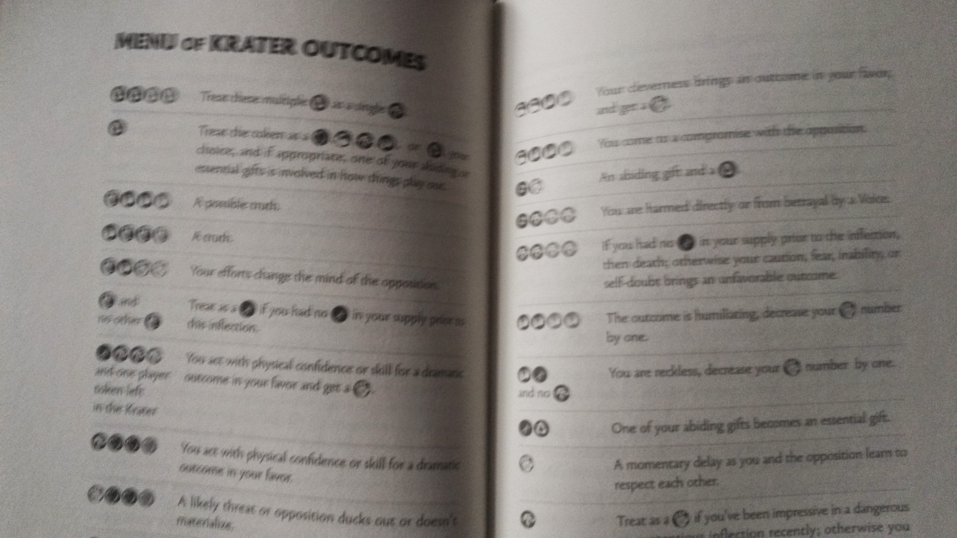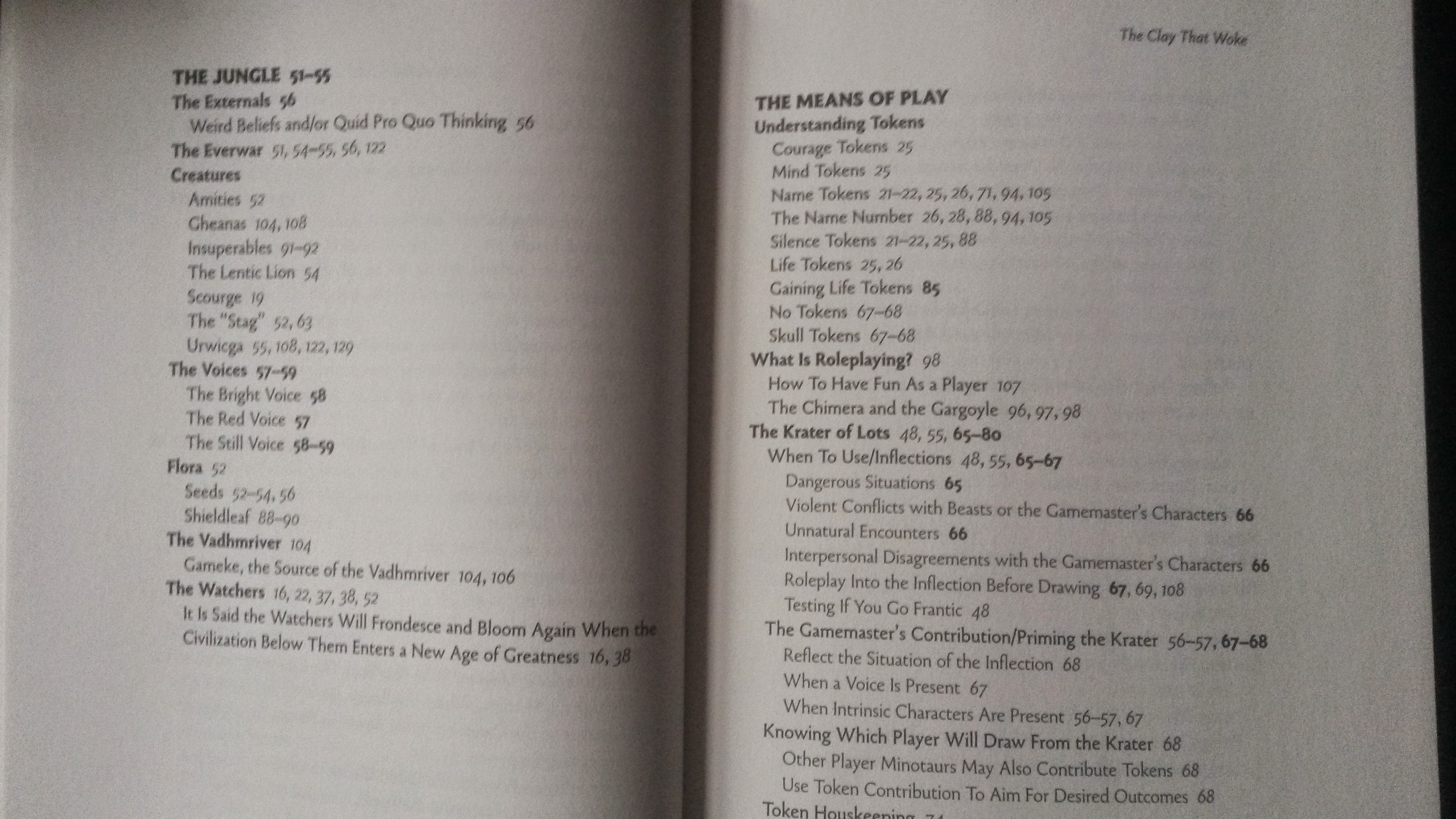 En af de interessante ting ved The Clay that Awoke er opsætningen af bogen, hvor regler og afsnit med stemningstekster krydser ind og ud af hinanden, mens 20150106_093652 20150106_093758indholdsfortegnelsen sorterer de forskellige typer tekster.