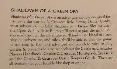 Shadows of a Green Sky er skrevet til Castles & Crusades, og det er tænkt som et intro-scenarie, der forklarer reglerne løbende undervejs. Der står ligefrem formuleret følgende (se billedet af teksten).