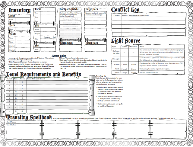 Torchbearer Character Sheet sde 2 - udstyr er oppe i venstre hjørne.