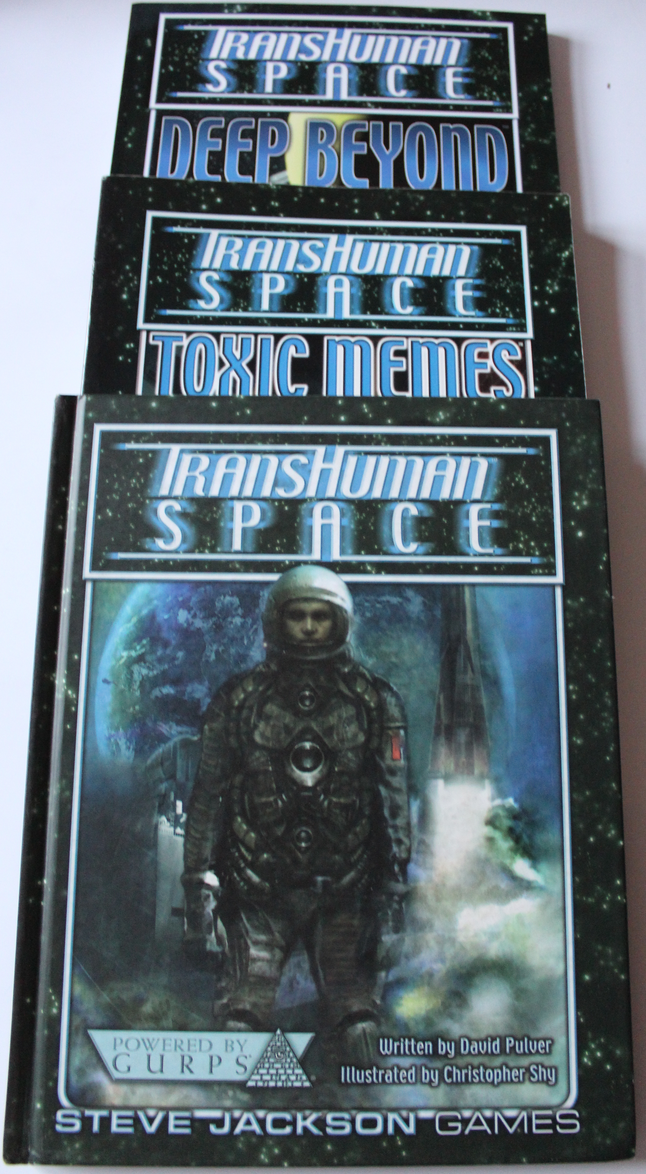 Grundbogen og to af de mange supplementer til spillet. Transhuman Space blev grundigt understøttet, og grundbogen var en lækker indbunden sag med flot artwork. Senere værker var ikke nær så flotte udgivelser.
