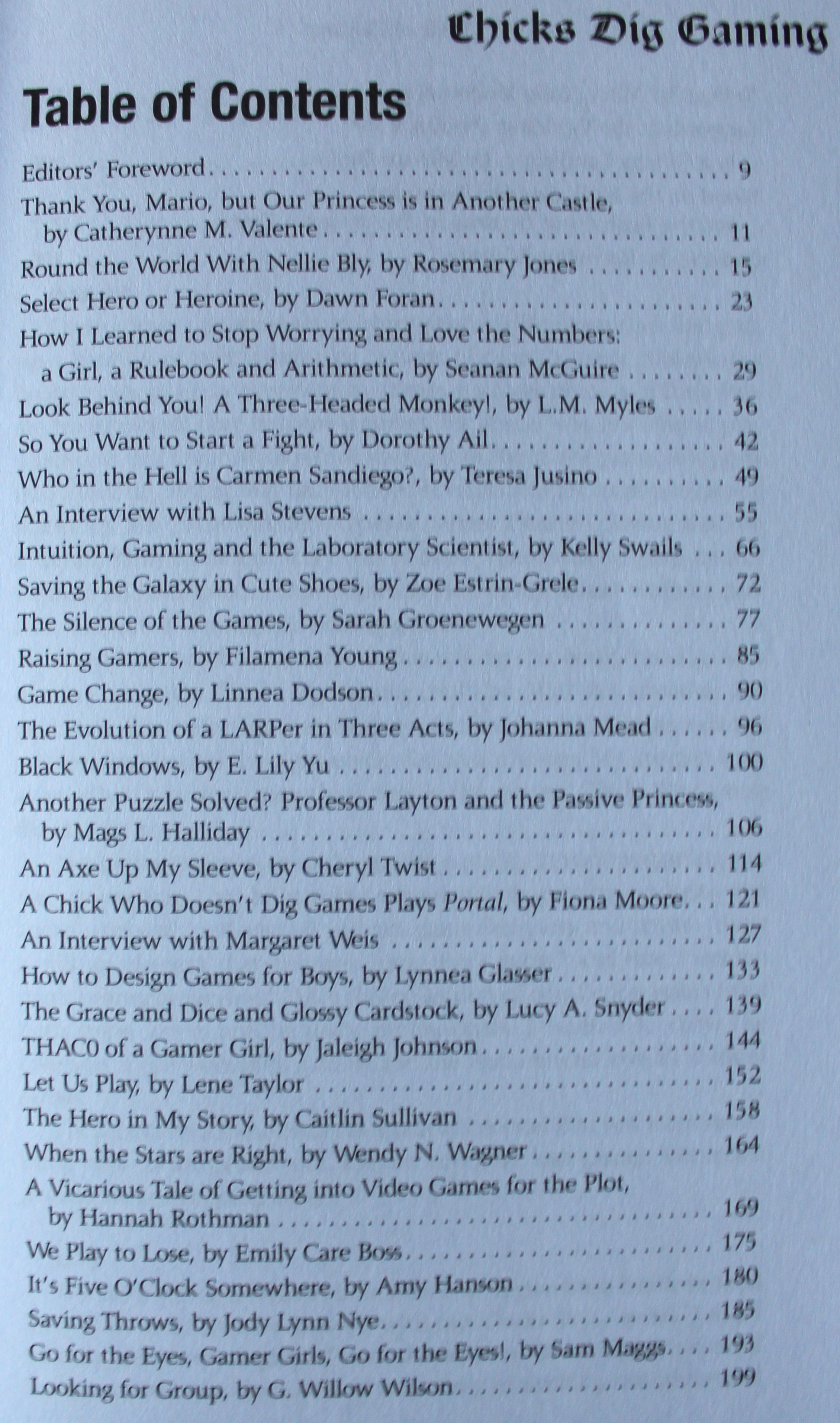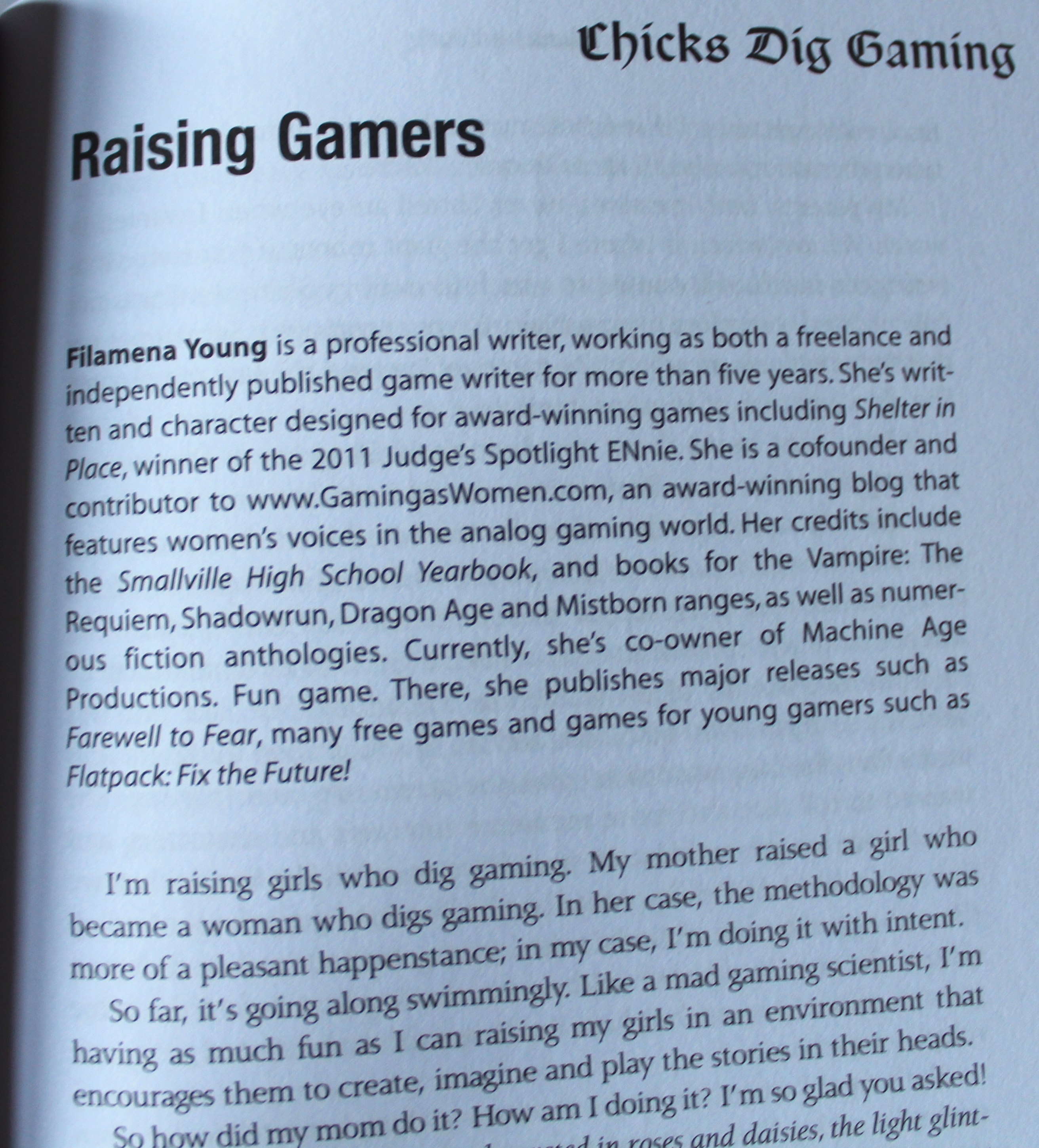 Men kvinderne er der, og Chicks dig Gaming giver dem en stemme, fortæller os deres historier og deres oplevelser med branchen og med hobbyen, og hvorfor de ligesom resten af os elsker rollespil (og brætspil og computerspil). Det er historier om modgange, når de ikke måtte spille med, eller når deres medspillere var trælse eller sexistiske, men det er også historier om at gøre det godt, stå i spidsen for at udgive rollespil, vokse op med rollespil og at finde sig hjemme i rollespilsmiljøet. Alt i alt er det gode og insigtsfulde historier at læse.