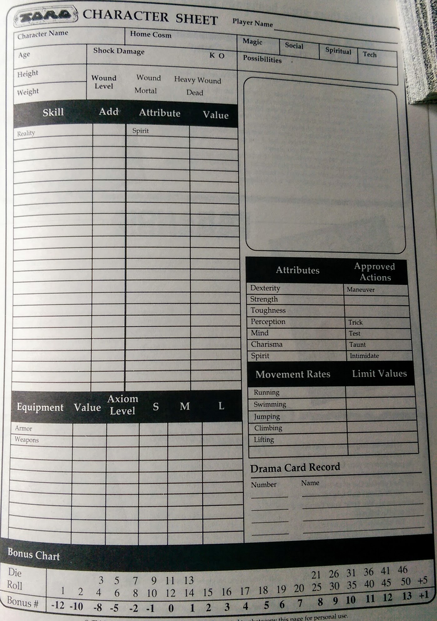 Karakterarket til TORG med en tabel i bunden af arket – ligesom Alternity og Earthdawn.