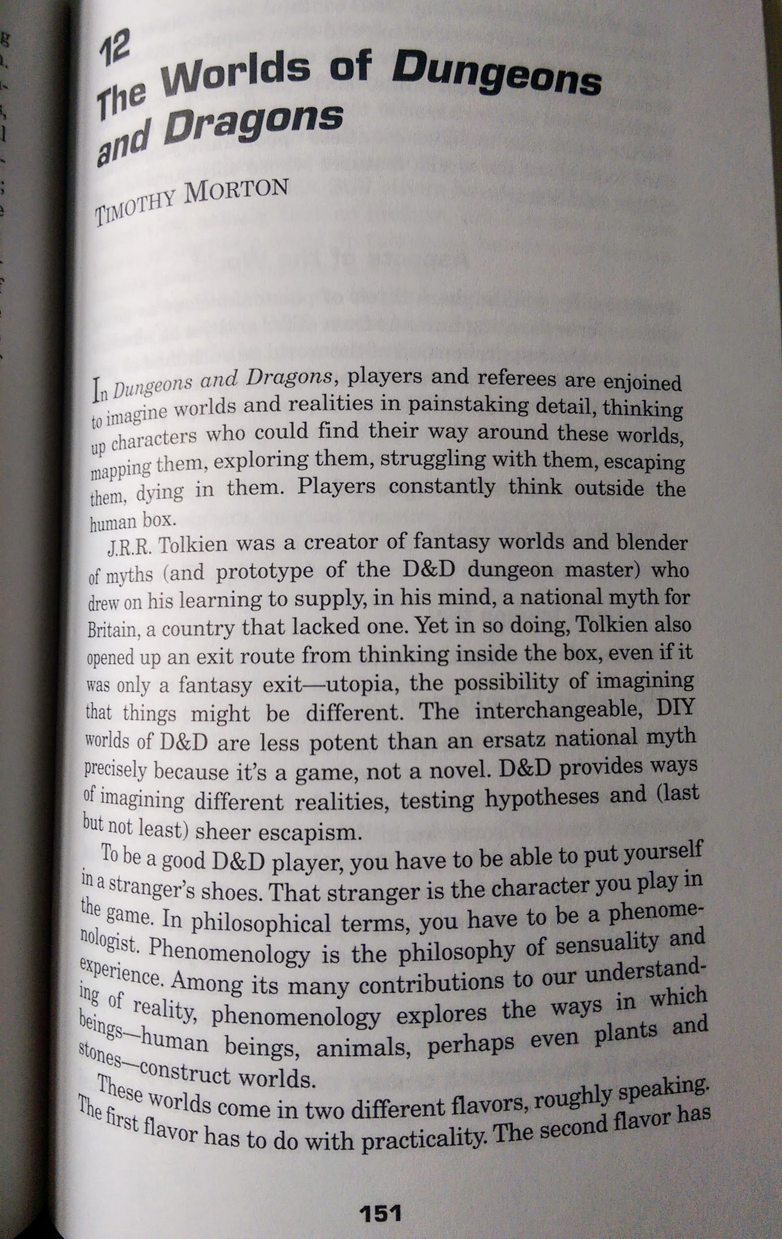 Dungeons & Dragons and Philosophy: Raiding the Temple of Wisdom er en samling af essays af vidt forskellige folk, som griber fat i forskellige dele af rollespil/Dungeons & Dragons fra konkrete diskussioner af alignments til generelle diskussioner af at agere i et fiktivt rum, og hvad det betyder for en som person. Nogle essays er lettere læste end andre, men de er sjove, og man kan ofte fornøje sig med at være uenig med forfatterne, men det er kun en god ting, for det ligger op til omtanke og debat – og bogens styrke er, at den viser, hvordan vi leger med tænkte verdener, og hvordan der kan være filosofiske