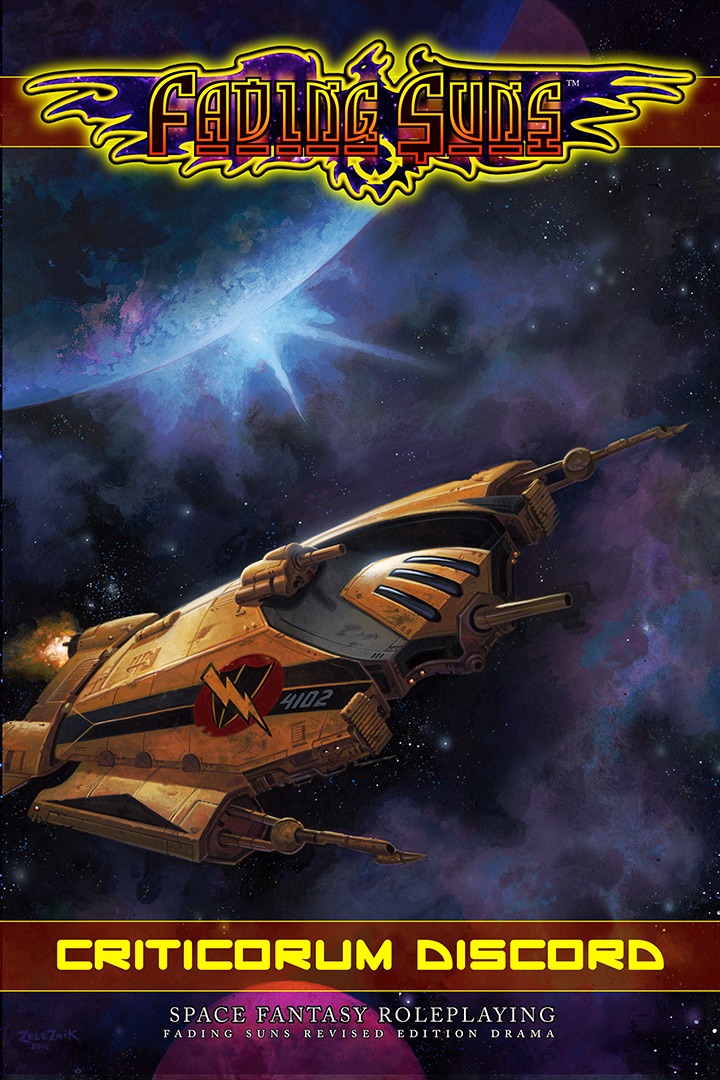 Fading Suns er middelalder-science fiction i rummet, og det er en af mine yndlingssettings, som jeg har svært ved at få på bordet, fordi jeg trods min glæde ved verdenen, ikke ynder regelsystemet. Det skal her handle om nyeste udgivelse til Fading Suns, nemlig bogen Criticorum Discord, som udkom som pdf i 2015, men jeg er ikke helt sikker på, hvornår bogen egentlig dukkede op efterfølgende (bag i bogen er reklamer for tre bøger til FS annonceret til at blive udgivet 2016, men de er aldrig dukket op). Bogen er udgivet af FASA Games, og både Fading Suns og FASA Games har en kringlet historie fra 2000 og frem til nu, når det gælder rettigheder og ejerskab, og hvordan det vil gå Fading Suns de kommende år er ikke til at sige.