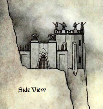 I muren er en port lukket med et faldgitter, og bag gitteret er et tæppe af grønne flammer. Et stykke bag muren er et hvidt tårn med statuer af krigere på toppen.