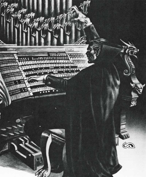 Bag dørene er en klart oplyst sal. Fra tre krystallysekroner højt under loftet kommer et klart lysskær, som oplyser et rigt dække langbord med sølvfade fyldt med velduftende og lækker mad. Der er dækket op til vore fire helte med fornem porcelæn og sølv og fra krystalglas kommer en liflig duft fra den søde, ravfarvede vin. Bagerst i salen er to titaniske spejle, der går fra gulv til loft, og de flankerer et vældig orgel. Fra orglet kommer de smukke, men triste toner, og her sidder en skikkelse med ryggen til selskabet og i en henrykt ekstase hamrer i tangenterne.