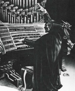 I den oplyste sal er en passage, der fører mod øst ind i mørket, som er flankeret af et par blankpolerede rustninger. En dobbeltdør på sned i vestvæggen fører ind til et klart oplyst rum, og herfra høres den majestætiske omend melankolske orgelmusik.