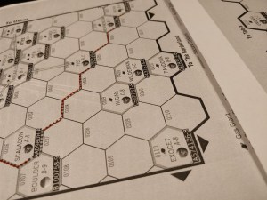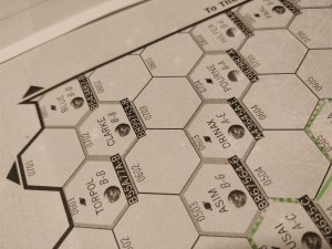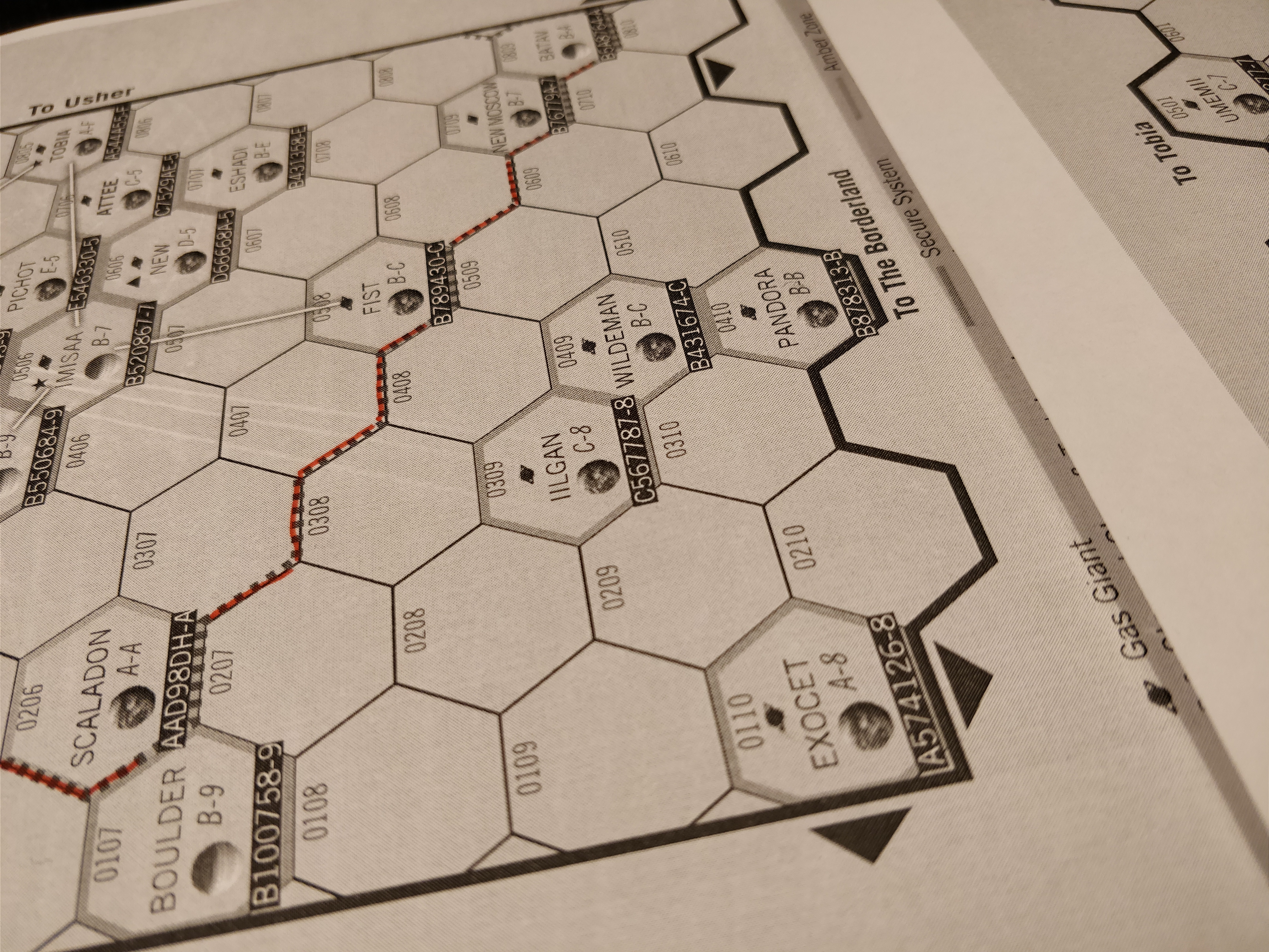 På bordet foran os ligger en stribe ark fyldt med hex-felter, og i felterne er solsystemer angivet med små talkoder. Med andre ark på bordet kan vi afkode talkoderne for, hvor store samfund, der er i solsystemerne, rumhavne, teknologisk niveau, planetære forhold etc.
