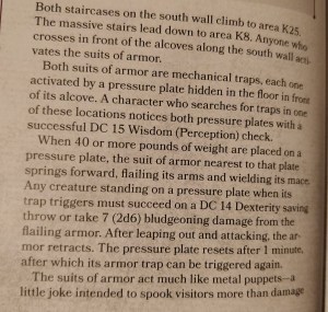 Denne gang springer rustningen automatisk frem i modsætning til de 60% chance. Fra et spilmæssigt synspunkt er det sjovere at se fælden i spil og lave en jump scare end at tjekke for, om der sker noget. De 60% chance i første version af scenariet skal dog ses i relation til, at alle trykudløste fælder har en %-sats for, om der sker noget. Den væsentlige forskel er, at nu laves et angrebsrul for rustningen (som i D&D 5th termer har ca. +12 attack roll), men skaden er den samme (og mængden af hit points i 2nd edition er ikke meget anderledes end i 1st edition).