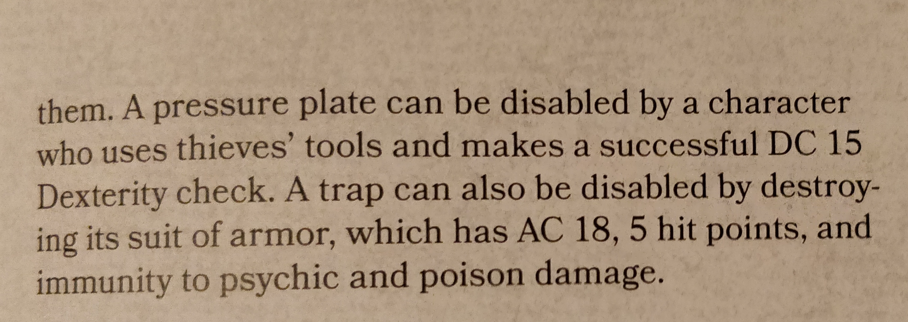 Ligesom i AD&D 2nd edition aktiveres fælden automatisk, men der er nu angivet, hvad der skal til for at få øje på fælden. Angrebsrullet er erstattet af et saving throw, og skaden er tilpasset D&D 5ths øgede mængder af hit points fra d4 til 2d6. Dernæst er passagen udvidet med et afsnit om, hvordan fælden demonteres, og hvordan rustningerne smadres.
