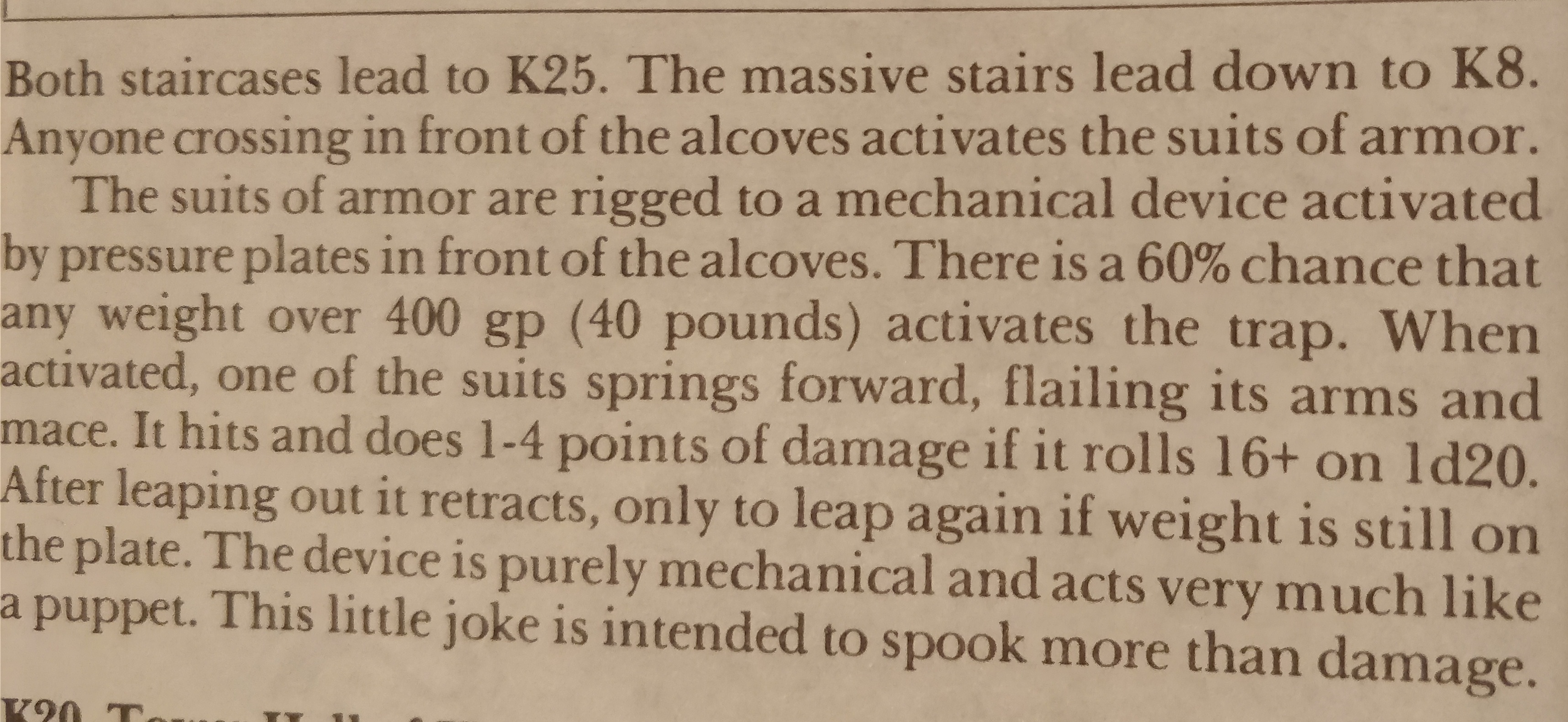 Denne gang springer rustningen automatisk frem i modsætning til de 60% chance. Fra et spilmæssigt synspunkt er det sjovere at se fælden i spil og lave en jump scare end at tjekke for, om der sker noget. De 60% chance i første version af scenariet skal dog ses i relation til, at alle trykudløste fælder har en %-sats for, om der sker noget. Den væsentlige forskel er, at nu laves et angrebsrul for rustningen (som i D&D 5th termer har ca. +12 attack roll), men skaden er den samme (og mængden af hit points i 2nd edition er ikke meget anderledes end i 1st edition).