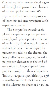 Vampire 5th edition har problemer med sin XP, fordi hvis man følger det skrevne oplæg, får man 1 XP pr spilgang og nogle gange et ekstra point. Prisen for at forbedre færdigheder, evner og discipliner er imidlertid meget høj, og man kommer derfor ikke til at have nogen mærkbar progression selv efter måneders spil. Som det fremgår af beskrivelsen af XP-reglerne, er XP heller ikke noget, som Vampire: The Masquerade egentlig gider beskæftige sig med.