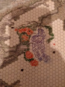 De næste par dage går rejsen parallelt med M’Bala plateauet, og selskabet ser dagligt grupper af flyvende øglefolk svæve over klippen – de har tidligere, da de sejlede sydpå af Soshenstarfloden, mødt dem og haft ubehagelige møder med de bevingede djævle – og selskabet beslutter sig for at camouflere sig, så de ikke bliver øjnet af de svævende patruljer (wandering monster-tabellen fortæller mig, at de flyvende øglefolk er ude og jage, og spillerne afsætter tid og ressourcer på, at deres karakterer er camouflerede for at undgå møder).