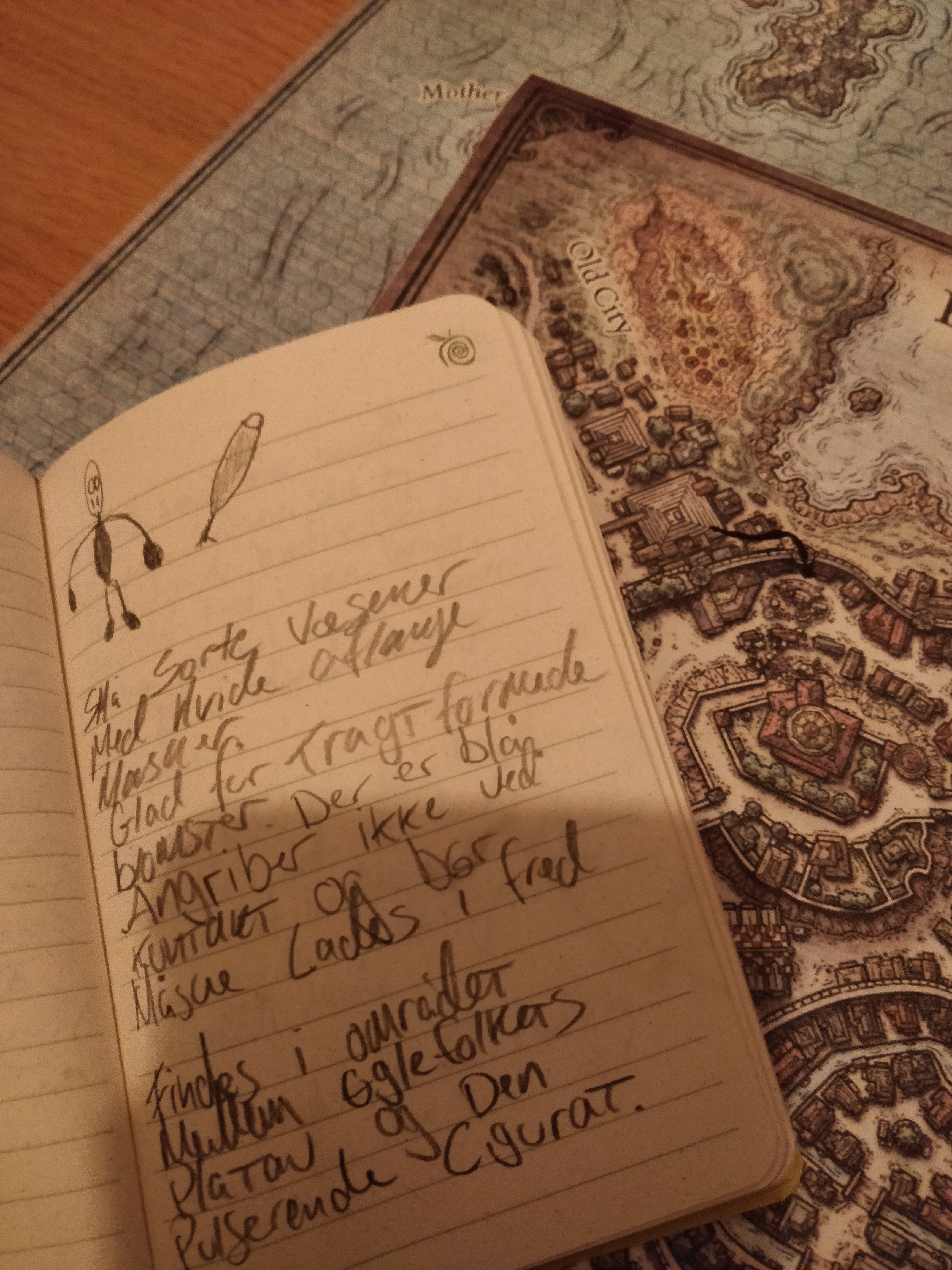 (Flyvende skibe er en del af Mystara-settingen, og vi har tidligere spillet en kortlivet D&D Mystara-kampagne, der handlede om det flyvende skib Himmelørnen; Samtalen med Leopol blev udspillet foran de andre spillere. Nogle gange er det sjovt at dele en gruppe op og tage en sådan samtale uden for lokalet, men det er noget, jeg i begrænset omfang praktiserer – i stedet lod jeg de andre spillere lytte med, da oplysningerne er nogen, som beriger ‘publikums’ (dvs. spillernes) forståelse af situationen, og det giver noget spil mellem spillerne, når de ved, at der er oplysninger, som bliver holdt tilbage for deres karakterer)
