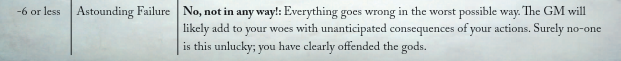 Jeg kan godt lide store omfangsrige tabeller, som skaber sjove effekter og situationer, som spillerne er nødt til at forholde sig til. I Apocalypse World er tabellerne korte, men de inviterer spilleder til at sætte ubehagelige valg op for spillerne, og i Dungeon Crawl Classics skaber de situationer og kulør – men foreløbigt har de i vores Warhammer-spil skabt alternative tidslinjer, hvor vi kigger på, hvor galt det kan gå med udfaldene af terningkastene (f.eks. et 00 på en Heal Test kan være ret så problematisk), men vi har hver gang negeret udfaldet af terningkastet og omstødt det. Warhammer synes at mangle et mellempunkt, hvor vi manipulerer udfaldet, men ikke fuldstændigt omstøder det. Vi har ikke tabeller, som har skabt spændende situationer for os, men katastrofale ulykker, som vi var tvunget til at undgå.