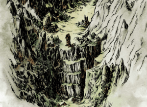 I bunden af dalen ulmer nogle bål endnu, og der er tre semi-permanente telte. En voldsom stank af latrin, destilleri og sprit hænger over området. Længere inde ses en grotteåbning i den ene side af dalen og en monumental port i den modsatte side. Inden for porten fører en slidt marmortrappe opad og ind i bjergets dyb. Selskabet sniger sig af sted, men Eira er en smule overmodig, og hun vrikker om på en løs sten, som skøjter hen over klippefladerne og ekkoer gennem dalen (Gruppen skal foretage et stealth tjek. Karakteren med lavest evne skal rulle, og det viser sig at med undtagelse af Nissel har de andre kun 3 i Stealth. Valget falder derfor på Eira, som ruller, men kun opnår en 1’er. Hun presser sit terningkast og ruller de to andre, men uden at opnå en succes. 1’eren giver hende nu en skade på Agility og vinder hende 1 will power point).
