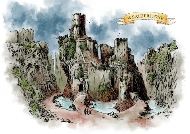 En fæl og ildelugtende voldgrav omslutter Vejrsten. Vandet er mudret og uklart, det bobler sært, og noget bevæger sig under overfladen. Broen er rådnet bort, og stumperne af stolper står stadig ude i vandet. Efter at have set sig omkring øjner eventyrerne en tømmerflåde inde i porten på den modsatte side af voldgraven. Med et velplaceret kast får Nissel slynget et reb med en krog over og forankret i tømmerflåden, og snart får selskabet trukket flåden ned i vandet og hen til sig (Vi ved, at en anden flok eventyrere er kommet spillerne i forkøbet, og de må have krydset voldgraven. Scenarieteksten fortæller, at man kan finde tømmer i nærheden og bygge en flåde eller vade gennem graven. Da spillerne spørger til, hvordan de andre er krydset, lader jeg dem øjne en tømmerflåde på den modsatte side, trukket ind i porten – der er nu tre måder at krydse voldgraven, og spillerne beslutter sig for at bruge de andres tømmerflåde).