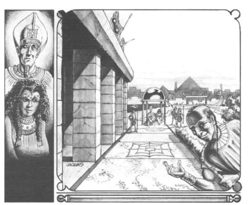 I en smuk gårdhave med søjlegange, hvor søjlerne er udformet som lotusblomster, der flyder på vandet, og mellem dem er udspændt robåde, sidder Ramenhotep XXIII og hans dronning Aketheti. Faraoen virker besynderligt åndsfraværende, og droningen fører ordet. Kort og kontant er prisen for nøglen til biblioteket, at gruppen forråder kong Ericall, deres lensherre, til hende, og hun vil belønne dem med vidtstrakte len og forøget magt. Gruppen stiller sig noget tvivlrådige over for dette, og de får en tænkepause, mens der serveres mad og drikke for dem – og imens krydsklipper jeg til trylletina, der er i gang med at udforske pyramidebiblioteket med sin Magic Eye spell, som kræver at vore magiker er inden for 80 meter af øjet. Inde i pyramidens dunkle og støvede gange er reoler tunge af skriftruller og bøger på et fremmed sprog – men en read languages formular er heldigvis forberedt – og trylletina konstaterer, at der kun synes at være to bibliotekarer derinde: Manden, der tog mod dem ved døren, og en blind gamling, som er i et centralt placeret kammer, hvor der er en trappe op og en trappe ned. I dette kammer er også et register over bibliotekets skrifter.