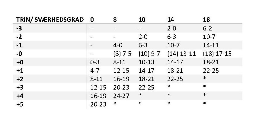 Bemærk, at i ovenstående eksempel med sværhedsgrad 10 trin 4 er trin +0 er at rulle 10, 11, 12, 13, mens trin -0 er at rulle 9, 8, 7; trin 1 bliver 14-17, mens trin -1 er 6-3. Opsamlet i en tabel for sværhedsgrad 10 kommer trinene til at se sådan her ud: