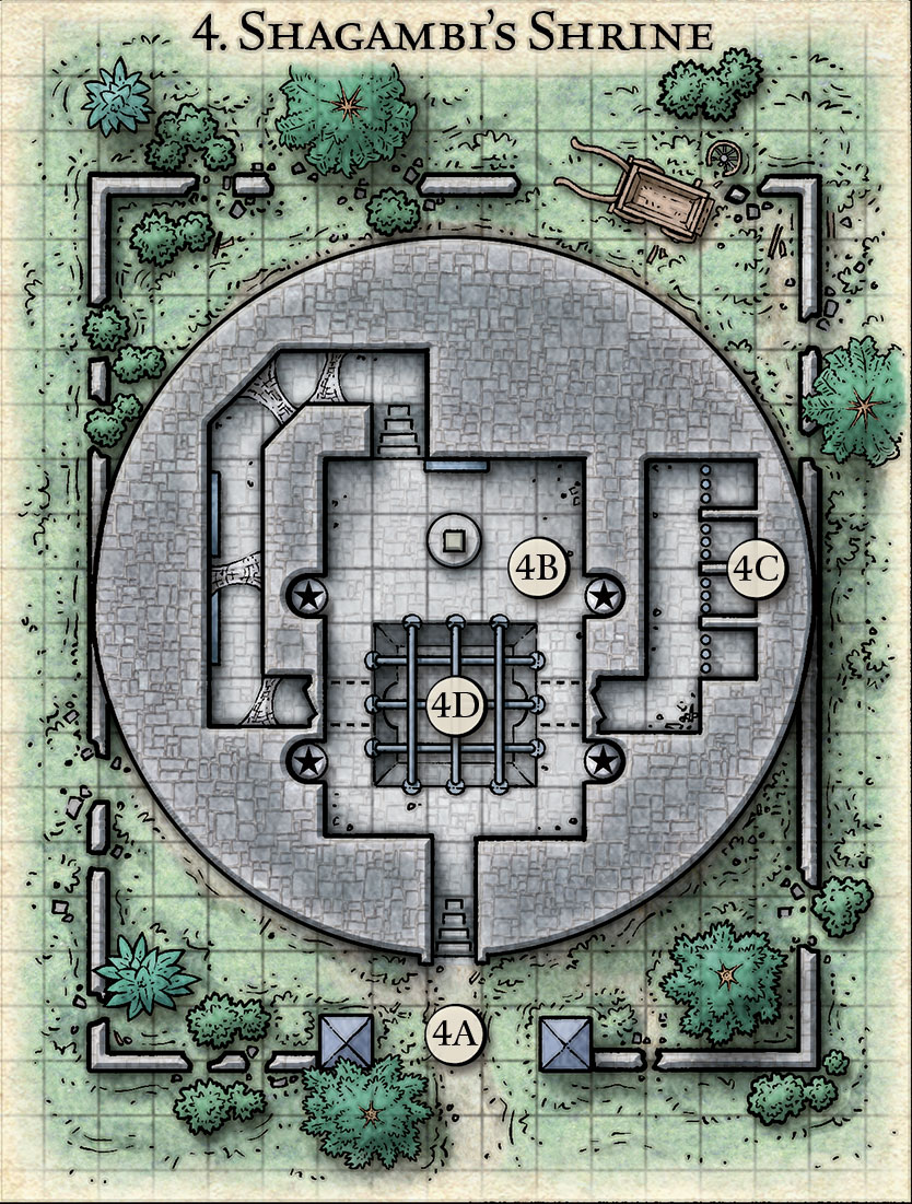 Den første gruppe er udhvilede, og de bevæger sig nu op til helligdommen. Det er en solid kuppelbygning med en tung stendør. Ved indhegningen er et par monolitter, og de er tilgroede, men man kan ane motiver af store kattedyr med slanger voksende fra skuldrene. Lourie genkender dem som Kamadans, som er en slags pantere, der har giftslanger voksende fra deres skuldre. De er farlige rovdyr.