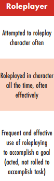 Imidlertid har spilleren glemt at føre dagbog og har ikke nogen tegnefærdigheder, så i spilgangen uden kamp, er der heller ikke XP for at være social. Heldigvis forbarmer vores spilleder sig over spilleren, og udvælger derfor en tredje kategori at give XP ud fra. Der er 30 IP fra kategorien Roleplayer: “Frequent and effective use of roleplaying to accomplish a goal (acted, not rolled to accomplish task)“.