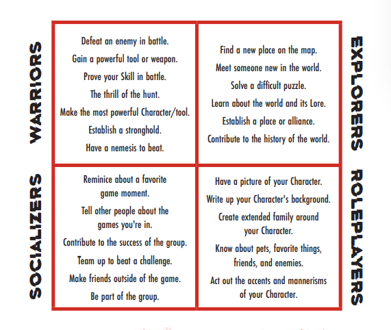 En spiller krydser af i skemaet: Defeat an enemy in battle, Prove your skill in battle, Have a Nemesis to beat og Reminice about a favorite game moment; Tell other people about the games you’re in. Det giver 3 fra Warrior og 2 fra Socializer.