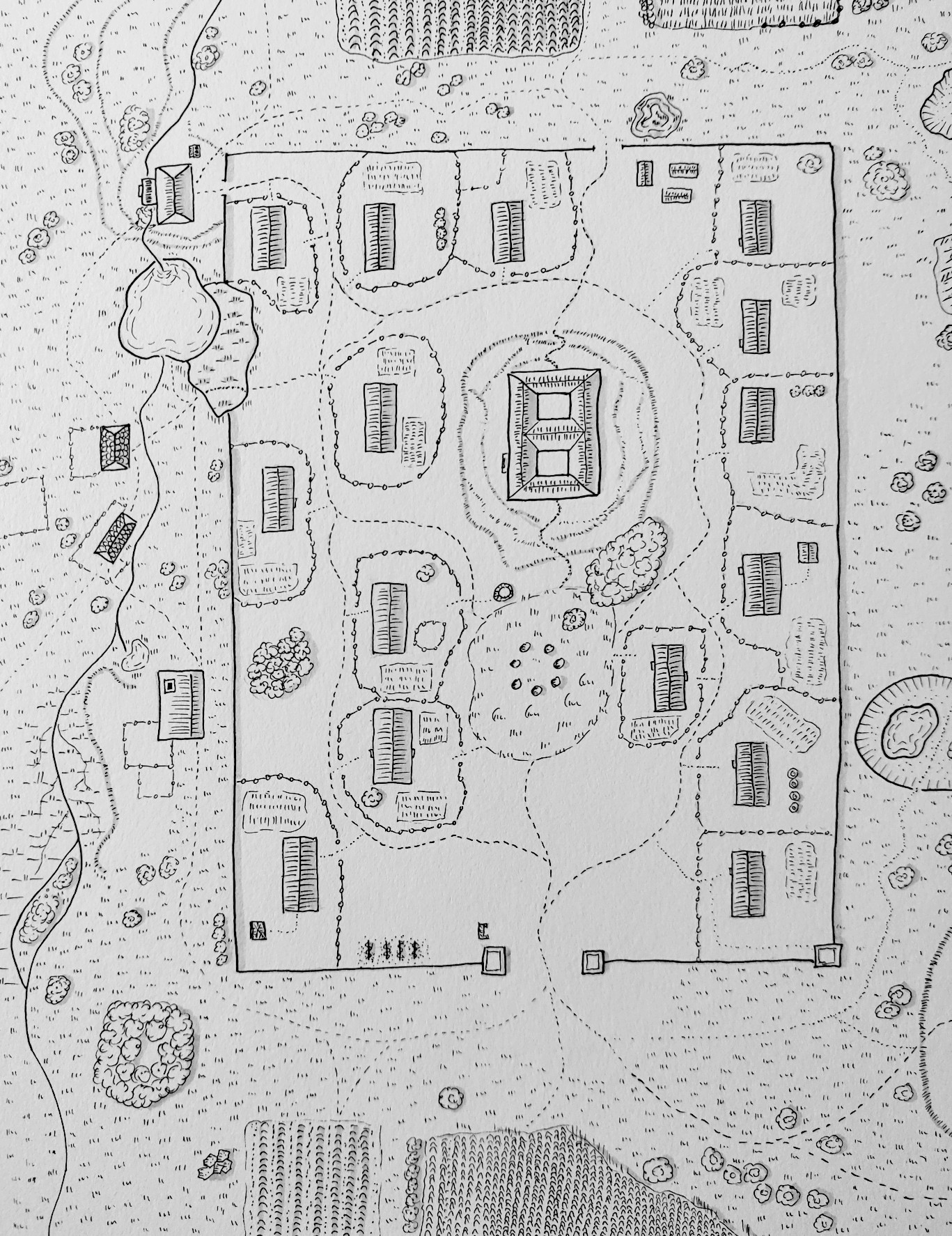 Fra landsbyforten kan man se byens brønd, som holdes forsynet af underjordiske vandledninger, som også forsyner palæets fiskedam med vand, hvor sjældne guldfisk svømmer rundt. Nede til venstre, hvor byen ligger lavere, løber en smal bæk langs ydersiden af byen, og her ses vaskekoner i gang med at vaske, og ikke langt derfra er mølledammen og byens vandmølle. Her er dele af den tidligere garnisons palisade blevet nedlagt for at landsbyen kan vokse.