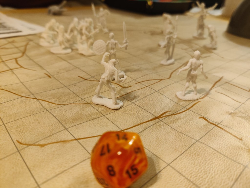 I stedet for at stoppe op og præ-kaste spells og lignende, går vi direkte til kamp med opsætning af figurer, markering af terræn og initiativrul. Runden starter med tre af vores helte, skifter derefter til monstrene og birollerne (de to elvere) og til sidst den fjerde helt. Sekvensen varer fem runder, og den tager to timer.