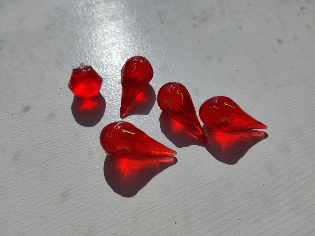 Dette sæt er ikke komplet. Disse ildkugle-formede 6-sidede terninger er alt, jeg har tilbage fra X-Con turneringen Flammestorm over Bronzestaden, som er et scenarie, der udspiller sig i efreeti’ernes kongsstad på ildplanet. Man havde hyret ildslugere, ildjonglører og andre til at optræde mellem spilbordene. Ved hvert bord havde man en skumslukker stående, og på bordene var opstillet modeller af Bronzestaden med levende lys (basalt set var modellen en forvokset olielampe). Mange terninger og karakterark gik tabt, da overmodige arrangører havde sat fakler op i fakkelholdere opsat med gaffatape. Gløder fra faklerne dryppede over et bord i en pause, og kort tid efter gik røgalarmen, som sendte alle spillerne fra pauseområdet ud i skolens gård en kold aften i februar.